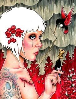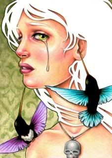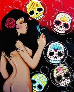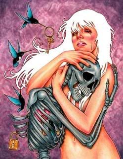 What caught my eye with Glenn's work was the mixture of the beautiful women, the colors, and of course the skeletons. I like artists that think outside of the box and use their imagination to the highest level. When looking at art, I like to "feel" some sort of emotion. He uses mixed media (no computers necessary) and I love how it's mostly with colored pencils. Excellent work. C&J applauds Glenn Arthur.